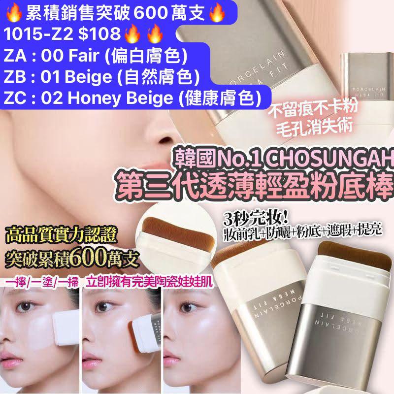 CHOSUNGAH 第三代透薄輕盈粉底棒,累積銷售突破600萬支!這款粉底棒結合了妝前乳、防曬、粉底、遮瑕和提亮等多重功效,只需3秒即可完成妝容,讓您輕鬆擁有完美陶瓷娃娃肌。 產品特點: * 第三代透薄輕盈配方,打造自然無瑕妝感。 * 一擰、一塗、一掃,簡單三步驟,快速上妝。 * 蘊含多重功效:妝前乳、防曬、粉底、遮瑕、提亮。 * 不留痕、不卡粉,毛孔消失術,讓肌膚看起來更細緻。 * 三種色號可選:ZA: 00 Fair (偏白膚色), ZB : 01 Beige (自然膚色), ZC: 02 Honey Beige (健康膚色)。 * 高品质实力认证,累積銷售突破600萬支。 這款粉底棒適合各種膚質,特別是追求快速、方便上妝,同時又希望擁有自然無瑕妝感的您。無論是日常通勤、約會還是參加派對,CHOSUNGAH 第三代透薄輕盈粉底棒都能讓您在短時間內打造出完美妝容,展現自信美麗。
