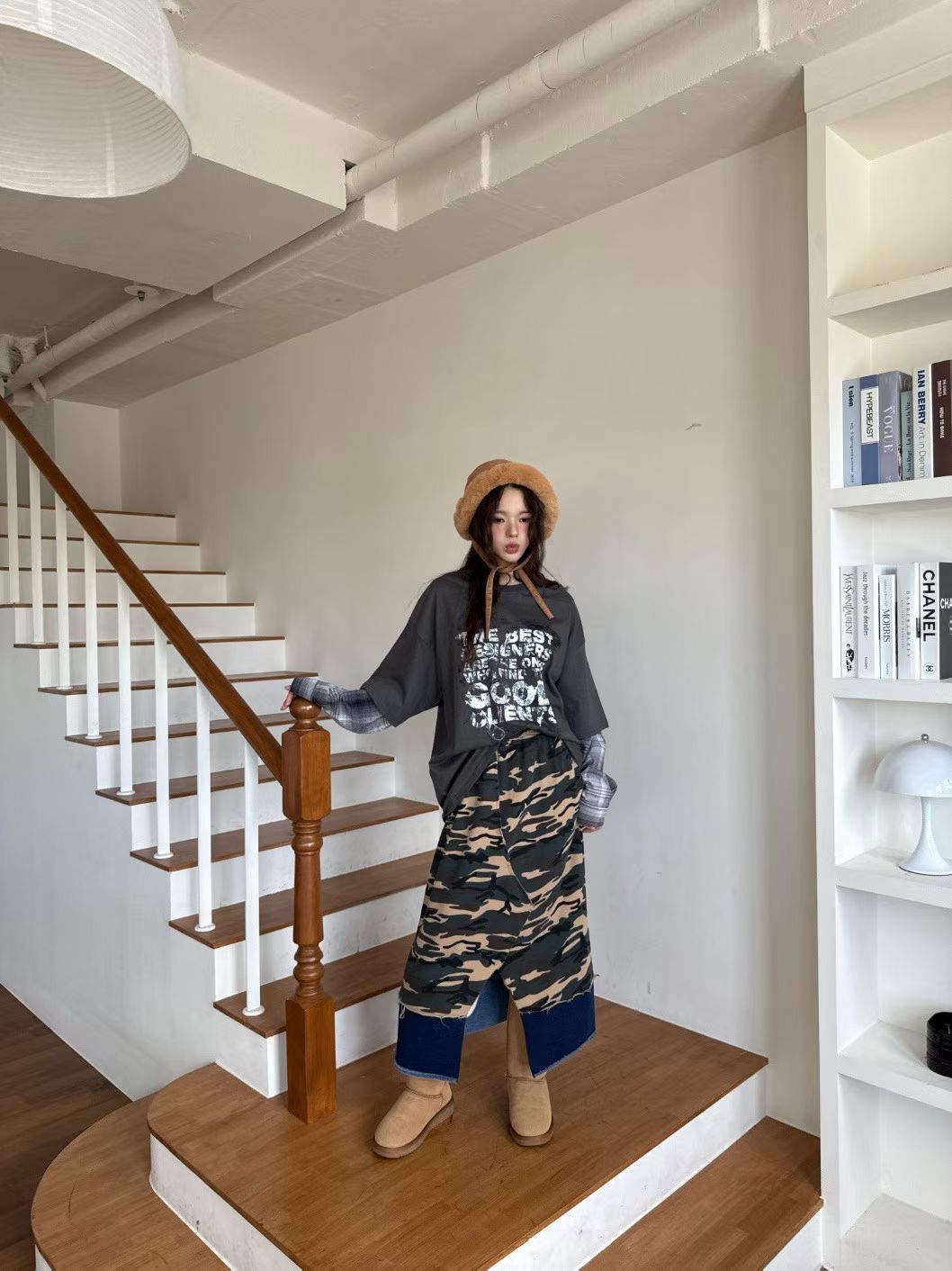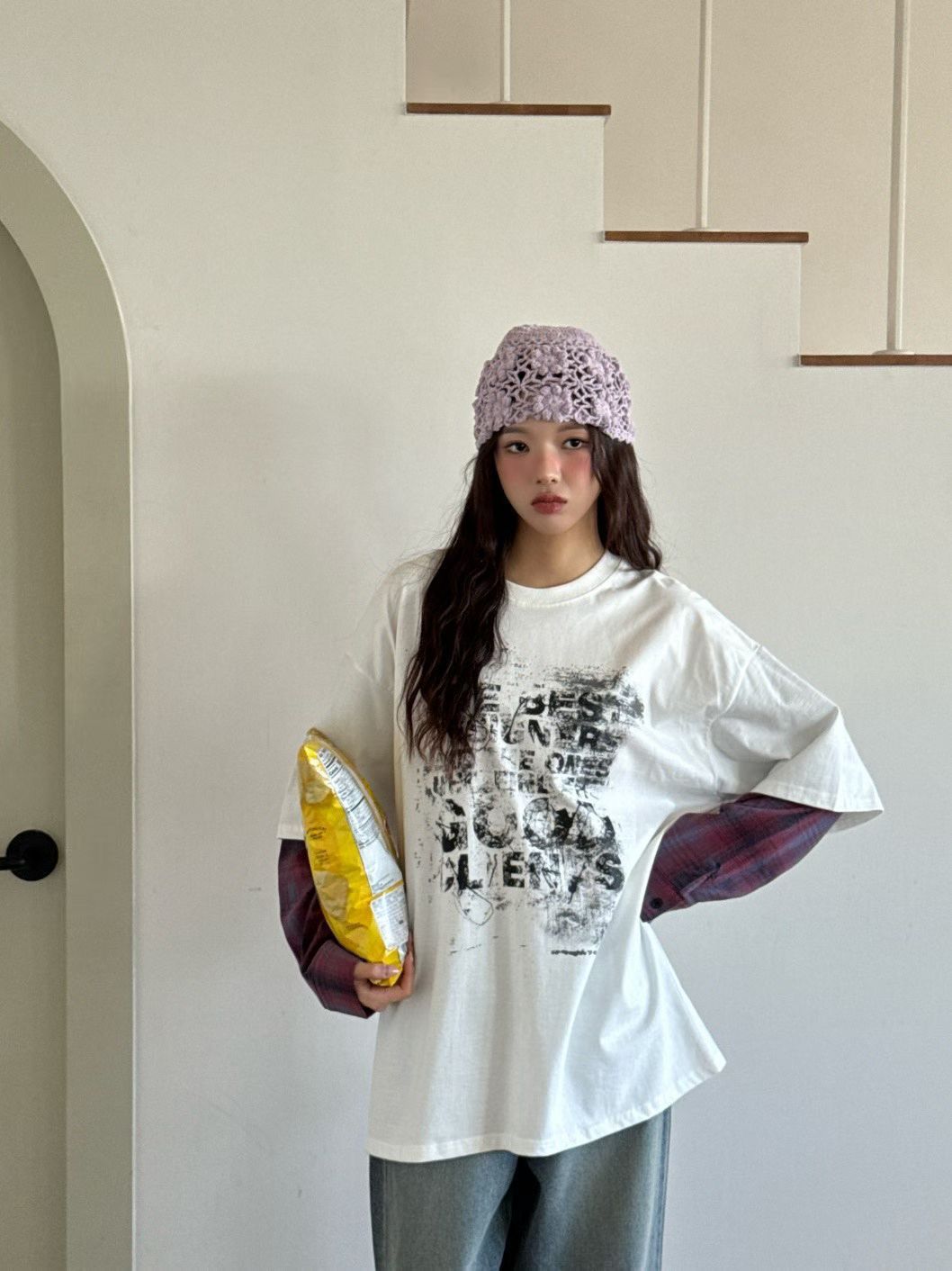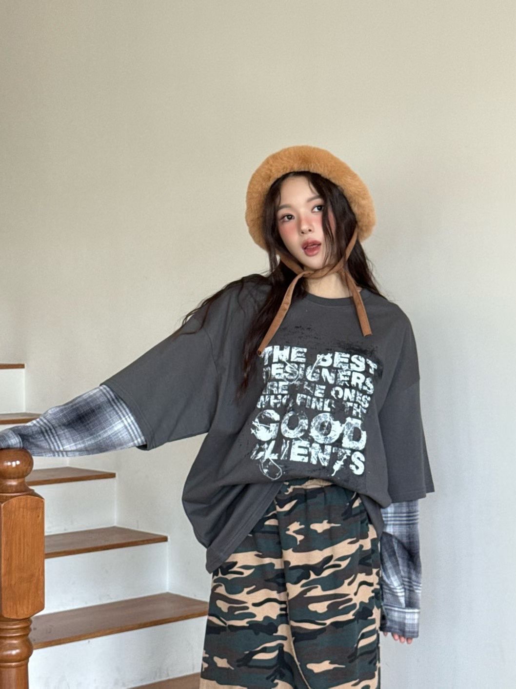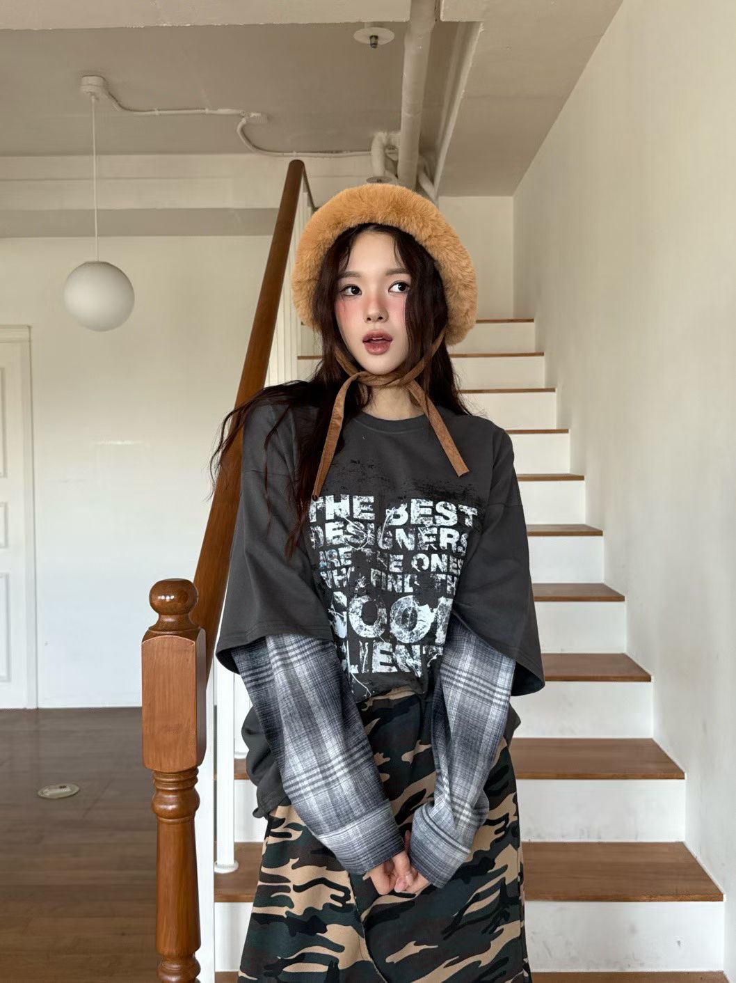 復古印花2 in 1寬鬆T恤搭配格子內搭