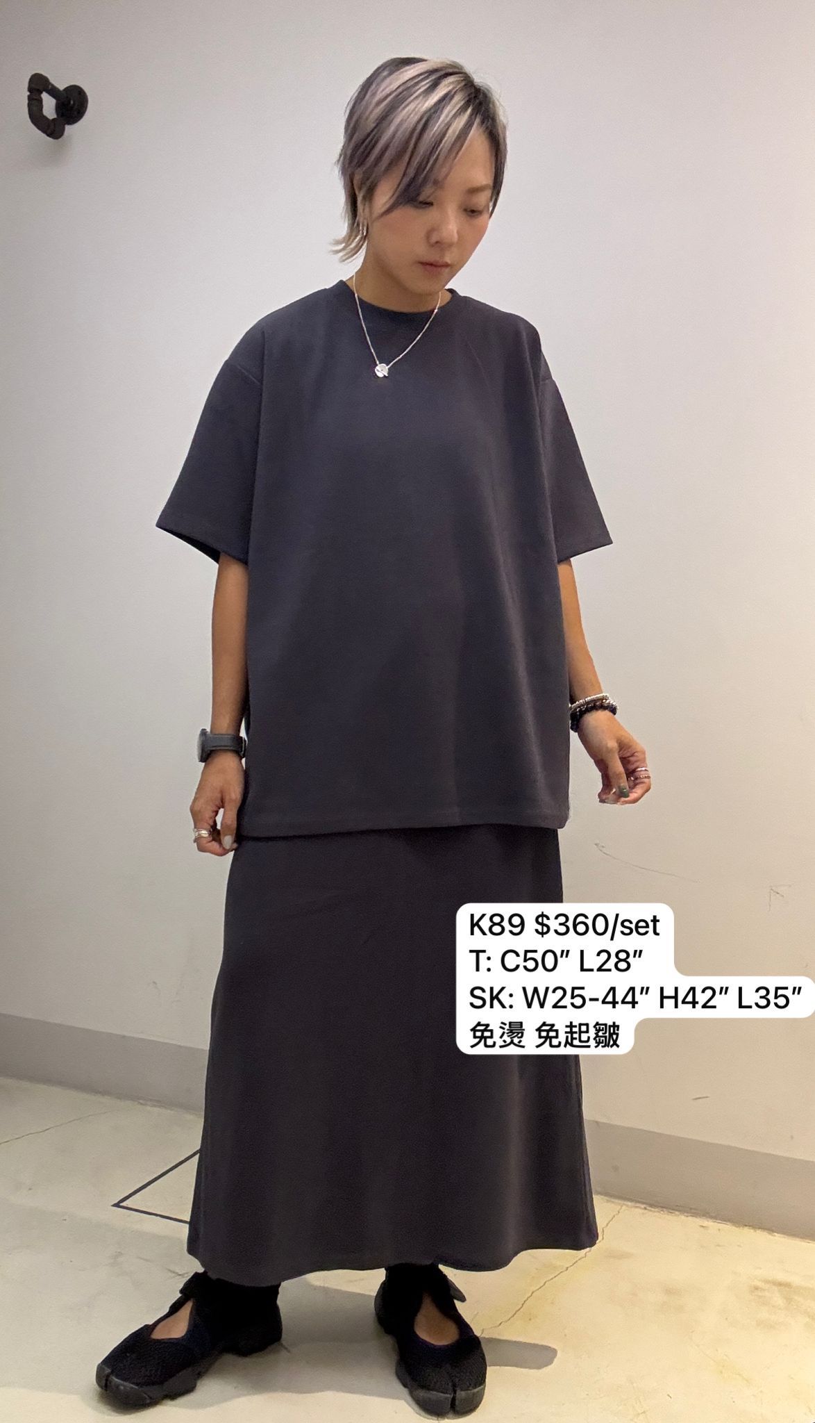 灰色時尚休閒套裝寬鬆T恤與高腰半身裙
