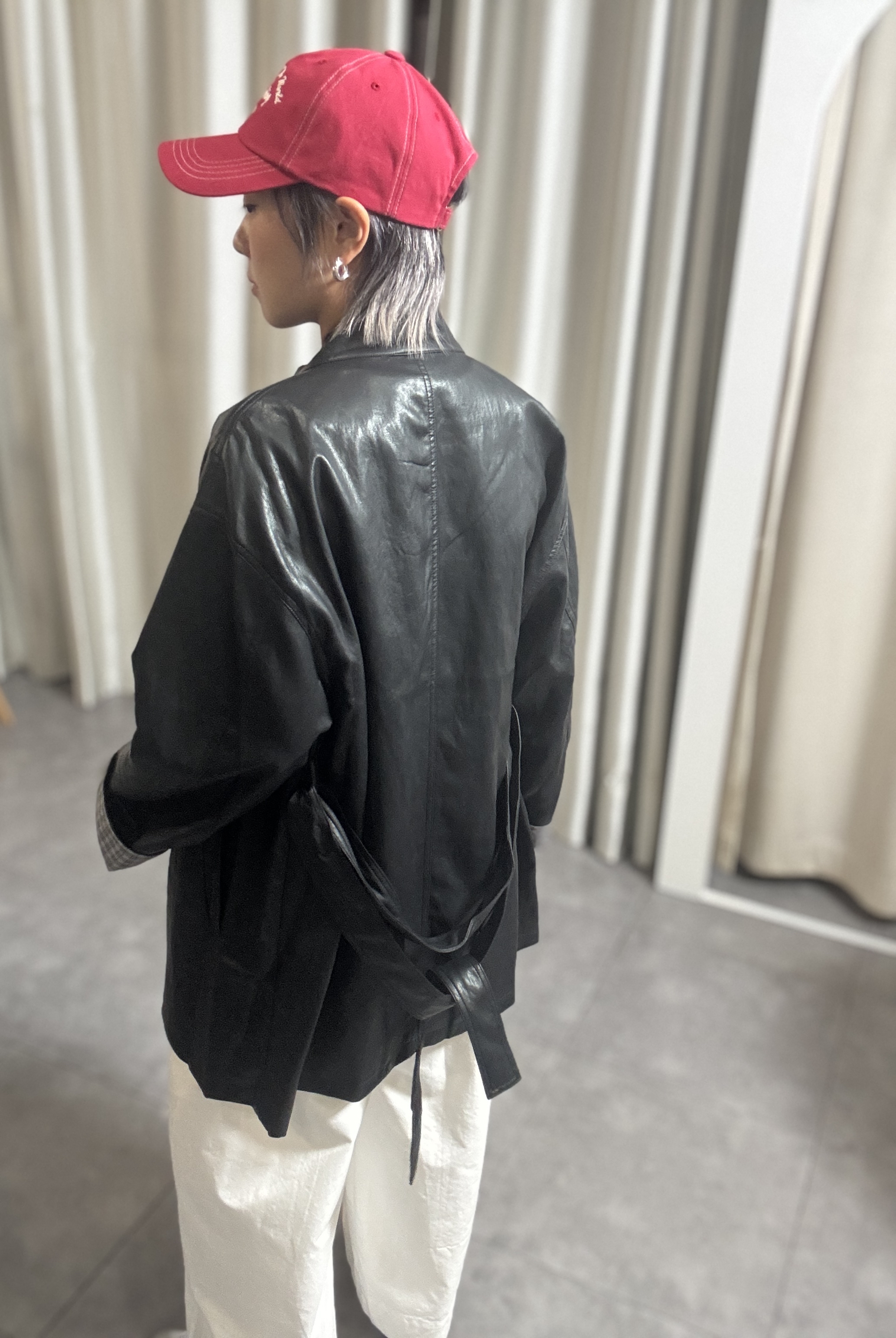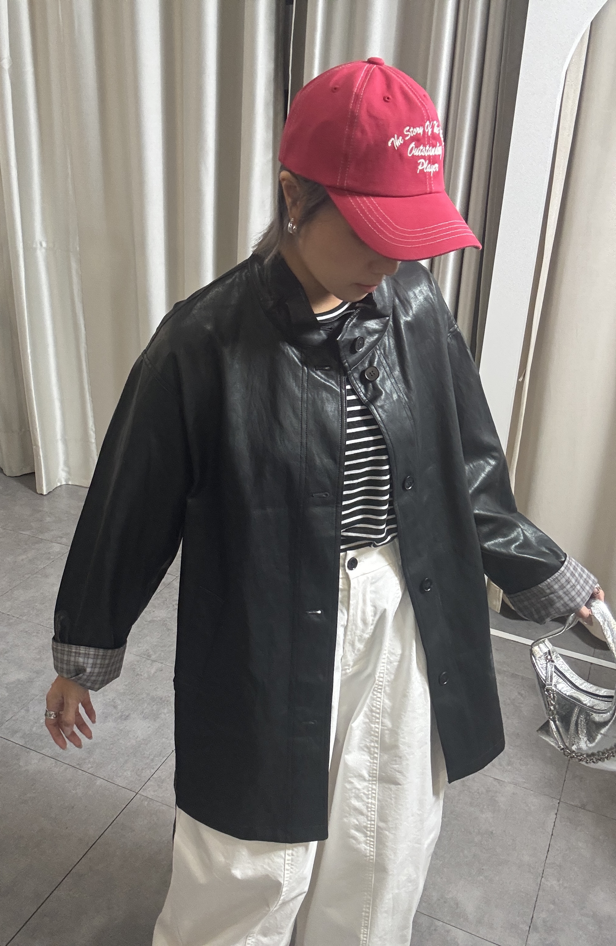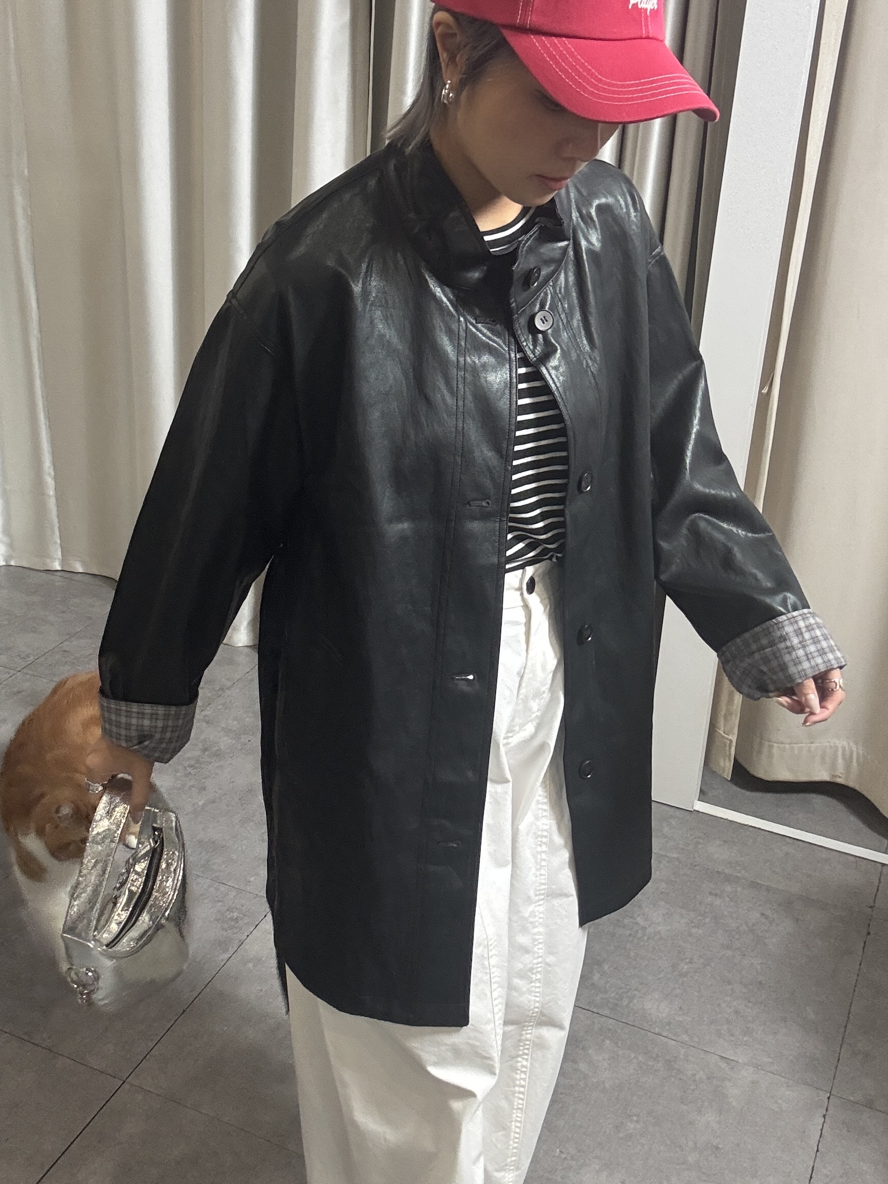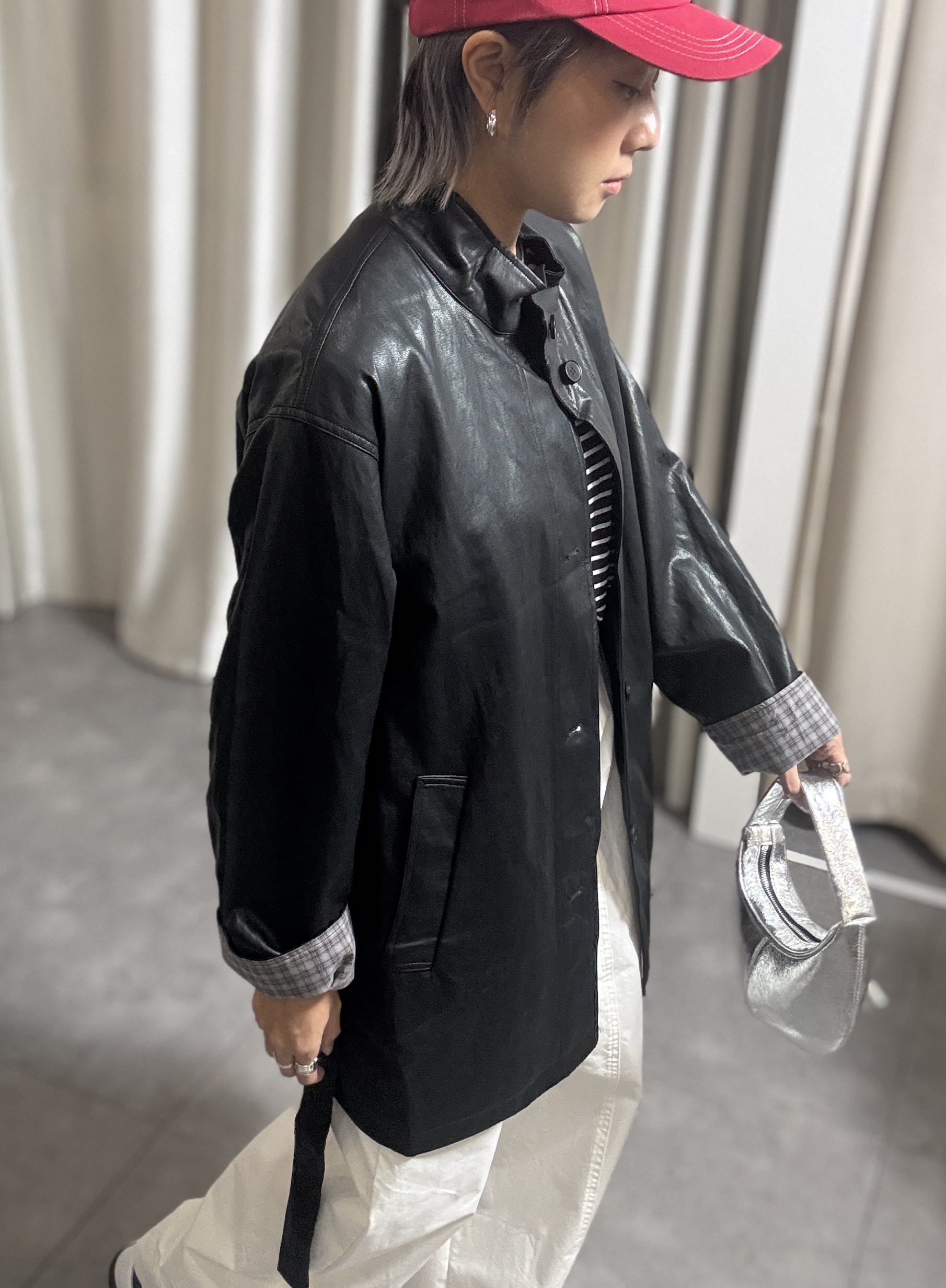 高質黑色仿皮撞格中長外套