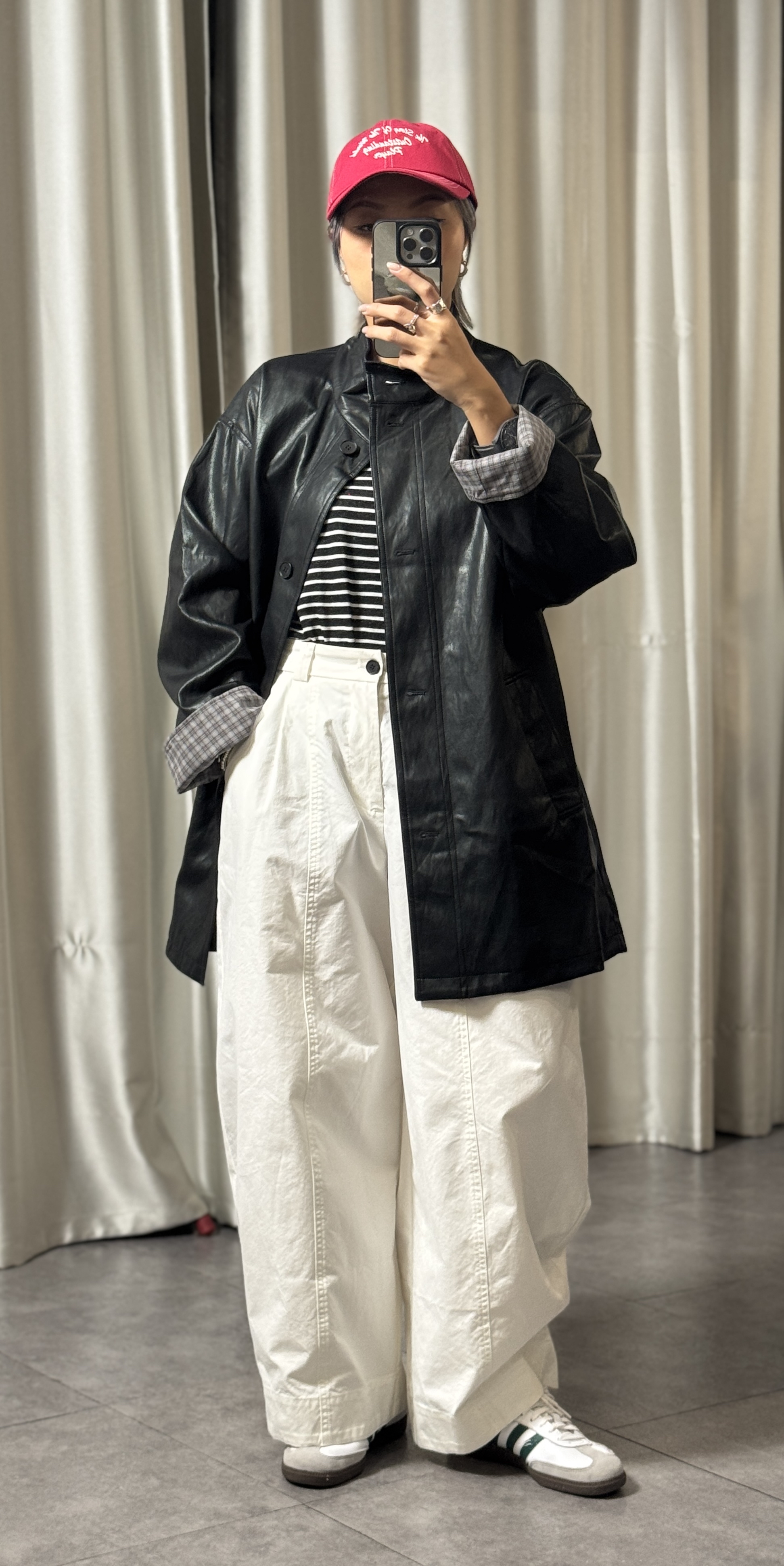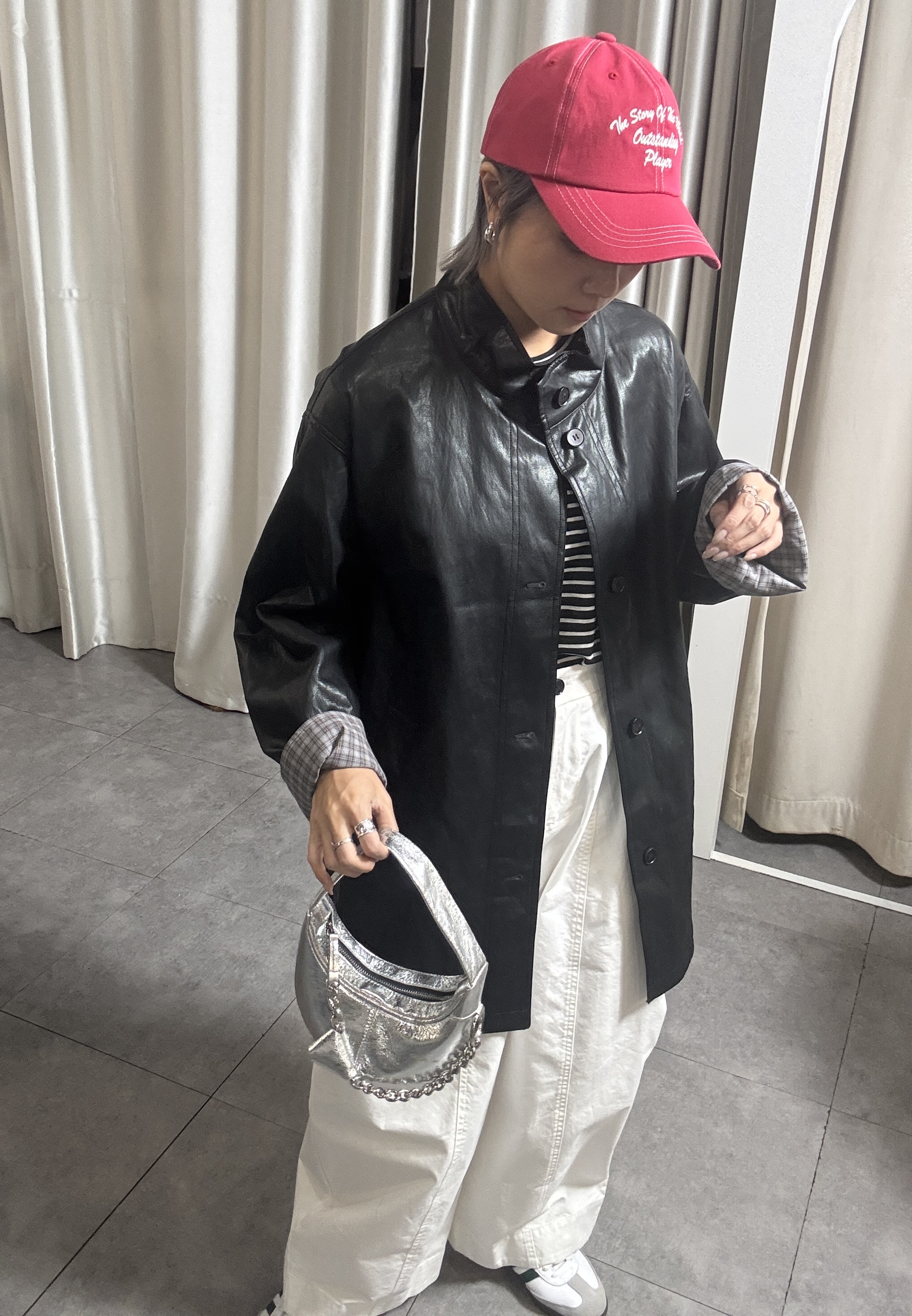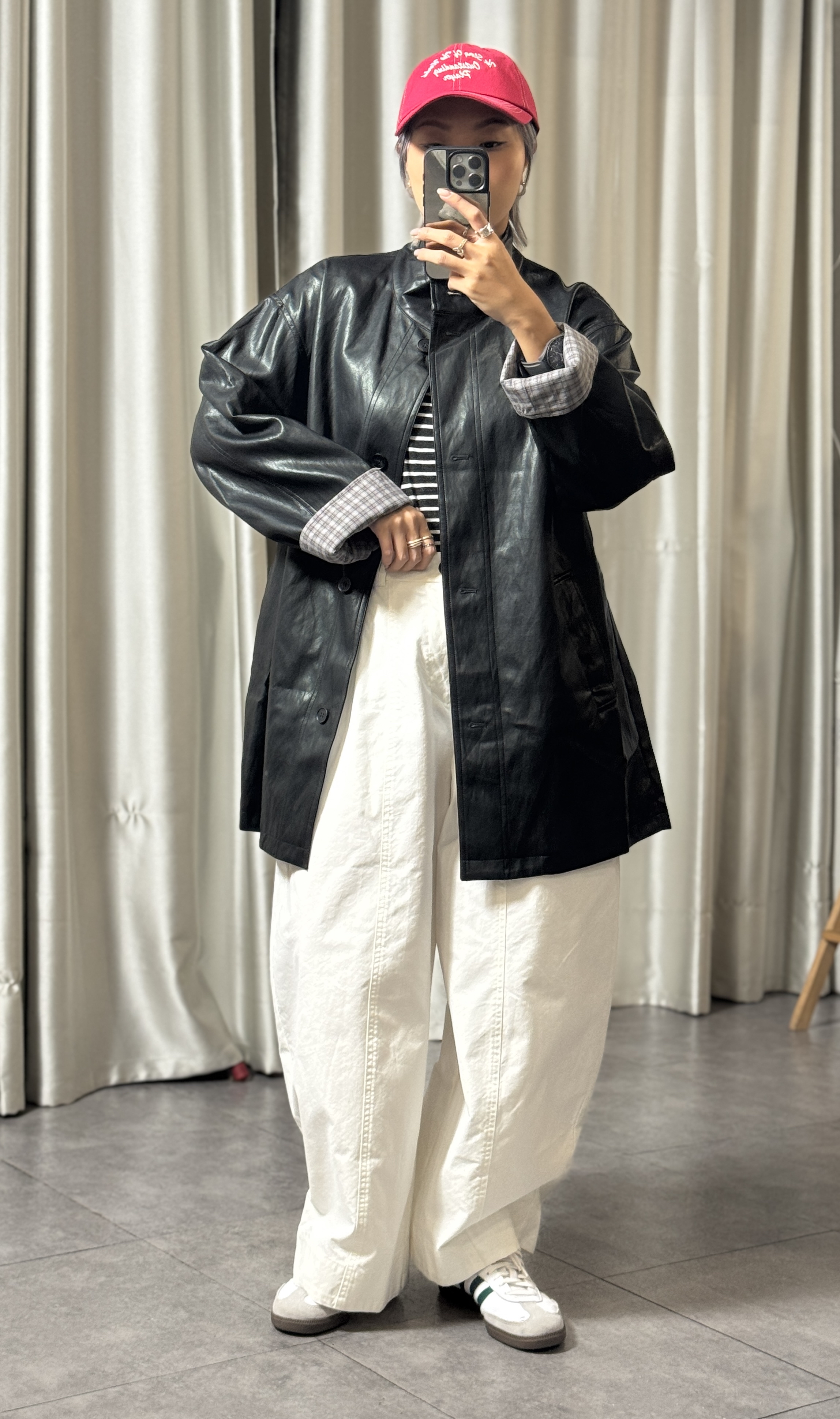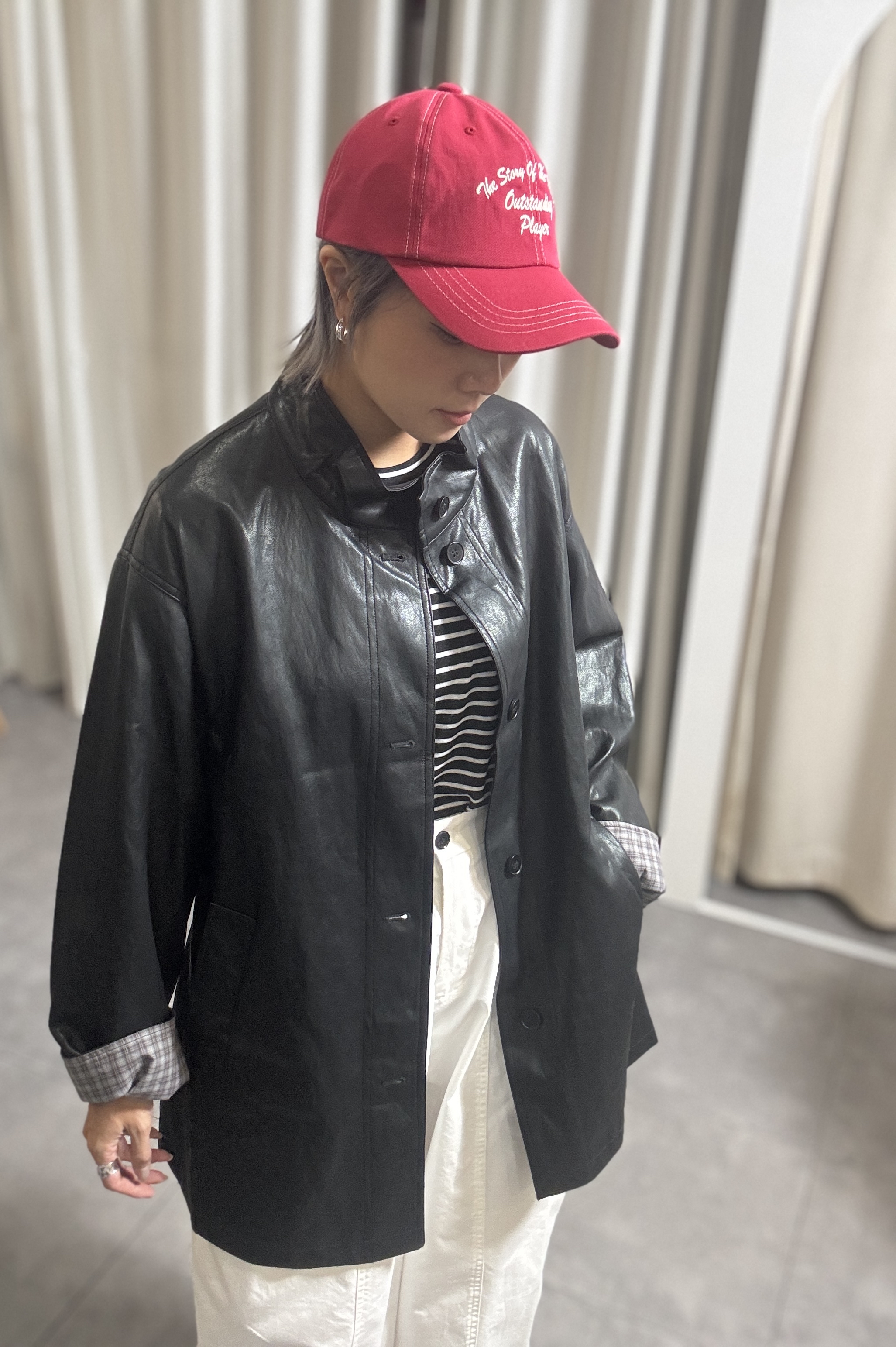 高質黑色仿皮撞格中長外套